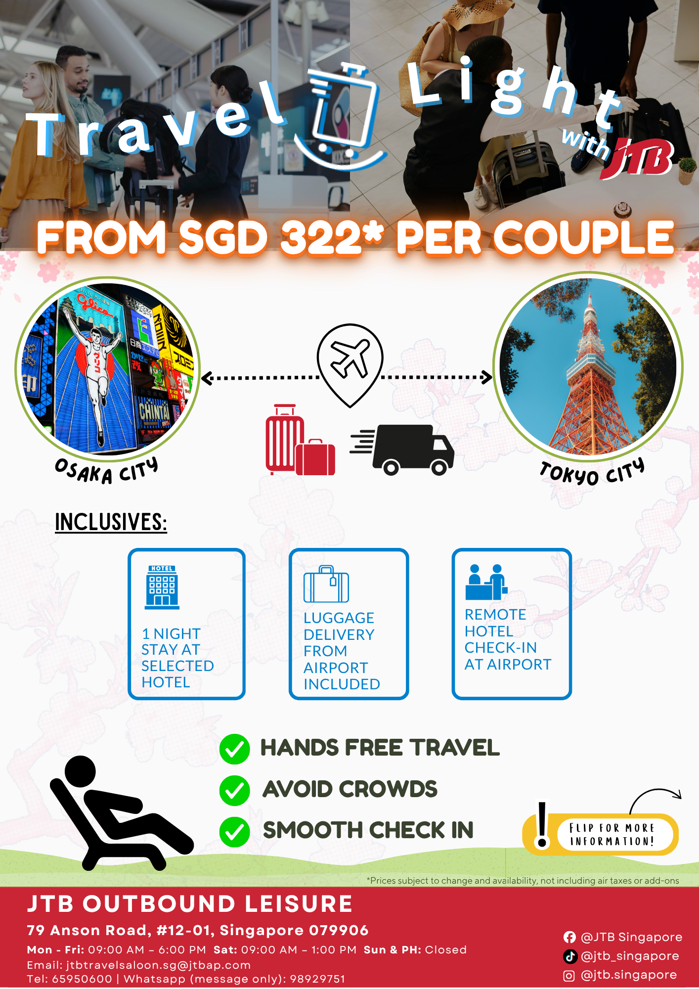 Our collaborate package includes a 1-Night Hotel stay at the supported hotels in Osaka and Tokyo alongside the remote check-in and luggage delivery service. Additional add-ons such as flight, USJ tickets, etc can be arranged.